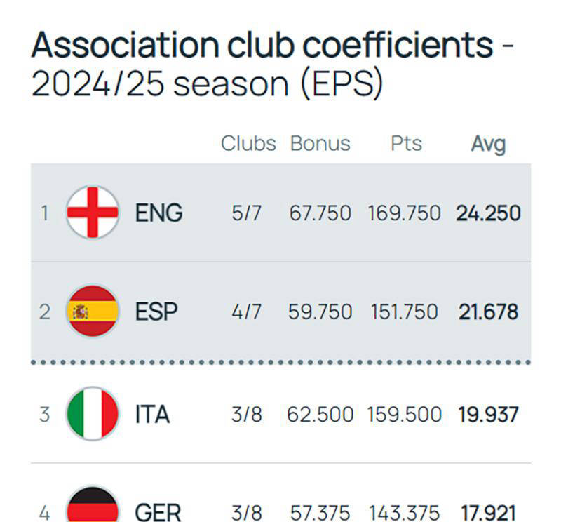 从欧足联的积分榜来看,英超基本锁定了本赛季的前两名,并且西甲领先意甲也有很大的优势。这意味着两个联赛的第五名将获得下赛季的欧冠资格,相比上赛季意甲和德甲获得的5个名额,现在只有传统的四个名额可供争夺。