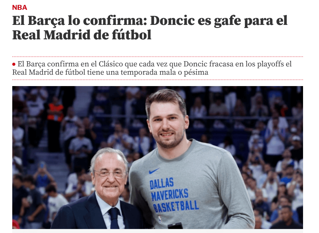 2022-23赛季,独行侠没有进入NBA季后赛,巴萨拿到了联赛冠军,皇马仅收获一座国王杯,而且在欧冠半决赛次回合0-4惨败于曼城。